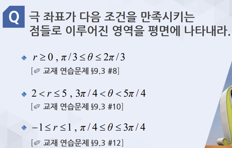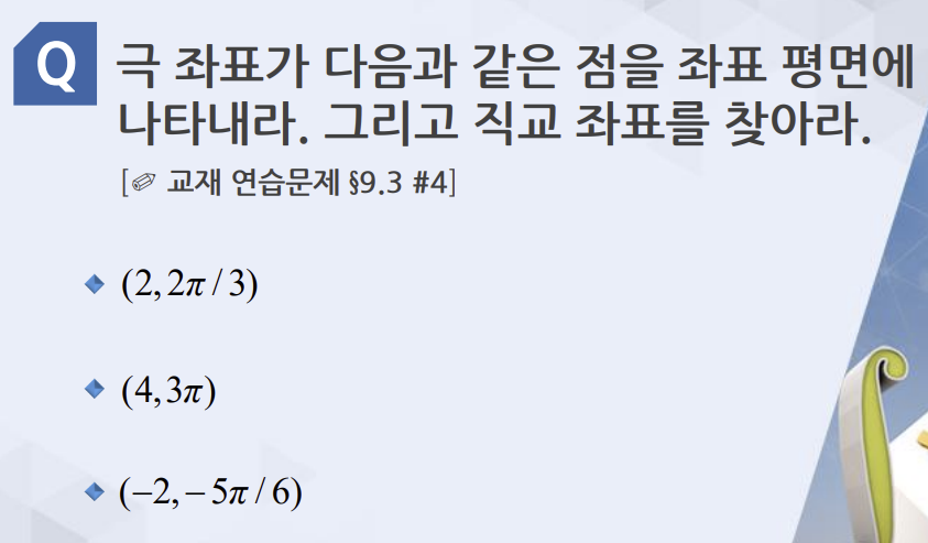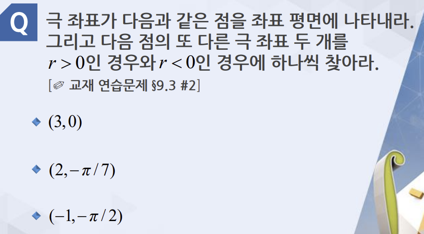 세번쨰꺼: xy평면에선 (0,-1), 그리고 극좌표로 표현햇을때 (-1, 2pi -pi/2)와 (1, pi -pi/2)