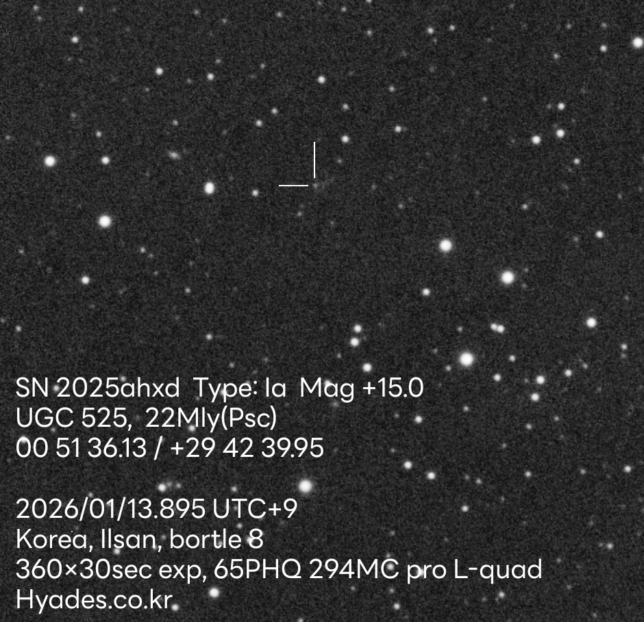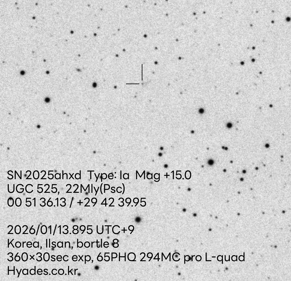 촬영 장소 : 일산 도심 8급지 / 2026년 1월 13일망원경 정보: Askar 65PHQ / ZWO ASI294mc Pro / SkyWatcher AZ-GTi / Optolong L-quad filter촬영 정보 : Gain120, 30s * 360 = 3hours소프트웨어: ASIAIR, Siril