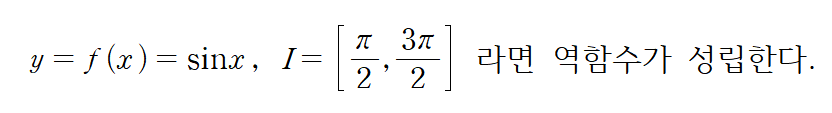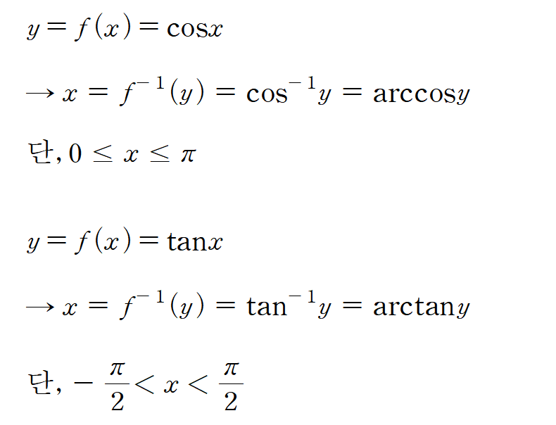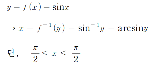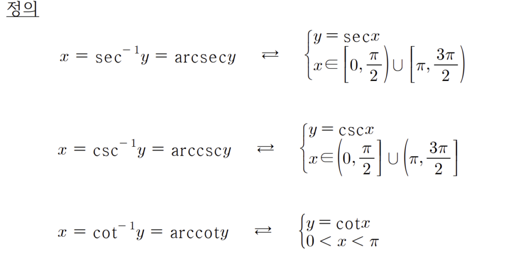 삼각함수는 일대일함수가 아니기에 역함수를 정의할 수 없다. 그렇기에 역삼각함수를 정의할려면 정의역을 제한하여 일대일함수로 만들어줘야 한다.