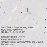 처녀자리 은하단에 위치한 NGC4168에서 터진 초신성 SN2026acd dl다. 밝기가 계속 증가하여 현재 13.6등급이다. 작년 관측된 초신성들중 13.6등급보다 밝은 것은 2개뿐이기에, 이번 초신성은 아마 2026년 터졌거나 터질 초신성들 중 밝기 기준 최상위권에 속할것 같다. 1월 24일 촬영한 버전