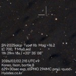 처녀자리 은하단에 위치한 NGC4168에서 터진 초신성 SN2026acd dl다. 밝기가 계속 증가하여 현재 13.6등급이다. 작년 관측된 초신성들중 13.6등급보다 밝은 것은 2개뿐이기에, 이번 초신성은 아마 2026년 터졌거나 터질 초신성들 중 밝기 기준 최상위권에 속할것 같다. 1월 24일 촬영한 버전